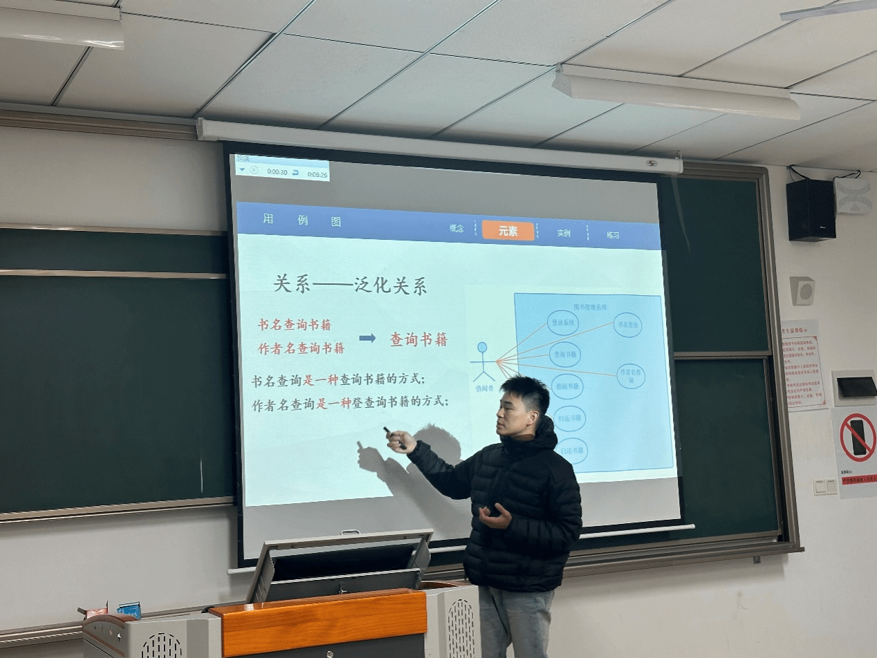 然后,何哲老师围绕《软件需求分析及建模技术——用例图建模》,以建筑房屋设计、图书管理系统等生活化案例为切入点,生动阐释了用例图在软件开发中的重要性,通过类比图书管理流程,引导学生对用例图中关系的理解,掌握如何精准捕捉用户需求与系统功能。