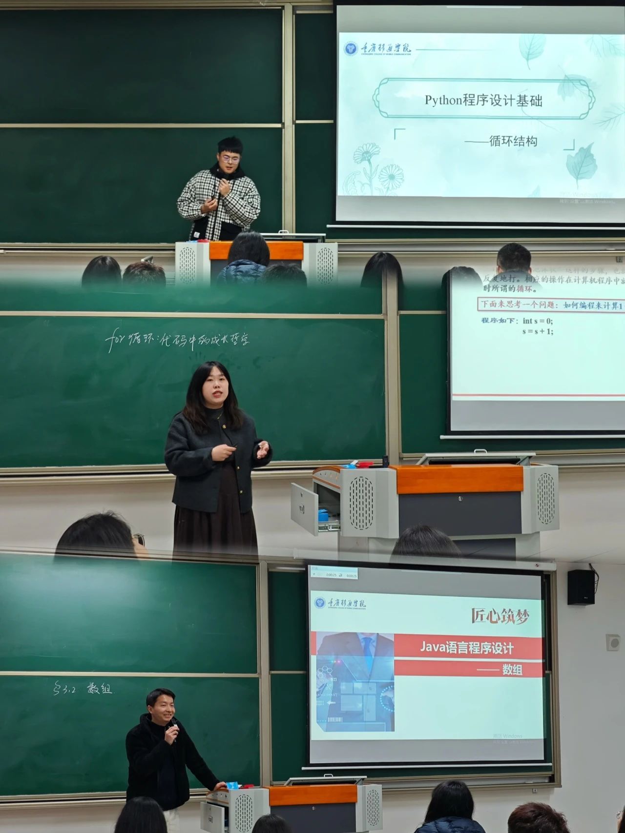 罗尧欢老师以《Python程序设计基础—循环结构》为题,通过案例分析、互动问答等方式,生动形象地将思政元素融入课堂;郑慧娟老师以《for循环:代码中的成长哲学》为题,将编程语法与人生哲理创造性联结,引导学生感悟“积累—突破—蜕变”的成长规律;王燚老师以当前热点影视IP《哪吒》为引,打造了一堂别开生面的《Java语言程序设计中的数组》课程,哪吒和敖丙成为数组名,他们的力量代表数组中的具体数值,通过这一形象的比喻,学生理解数组的基本用法同时也加深了对编程中元素间关联性的认识。三位教师的展示各具特色,既有理论深度,又具育人温度,赢得了现场阵阵掌声。