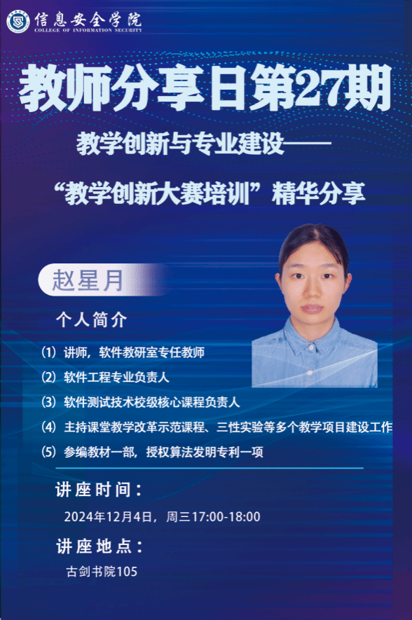 本次分享活动不仅拓宽了教师的教学视野,更新了教学理念,还促进了教师对教学创新及项目申报关键技巧的理解与掌握,为个人教学成长与学院专业建设积攒动力。新进教师更是从中汲取到快速融入教学工作、提升教学质量的宝贵经验。希望信息安全学院每一位教师在往后教学中,积极汲取前沿理念,深挖契合专业特色的教学创新点,助力培养优秀专业人才。