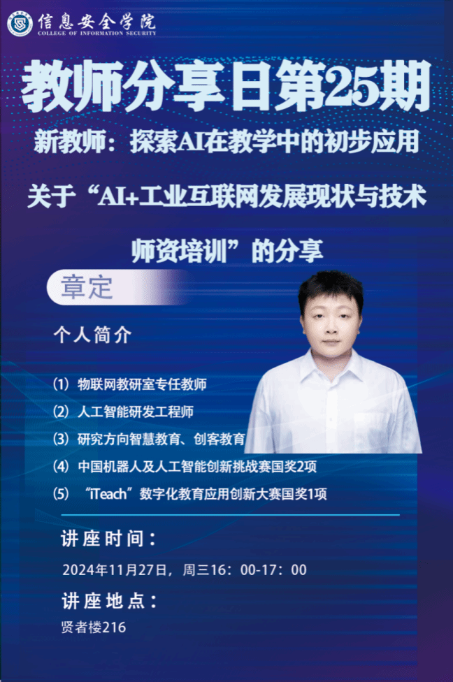 为拓展教师专业视野,激发新技术应用的讨论与合作,信息安全学院“教师分享日”系列教研活动第25期于2024年11月27日下午16点在贤者楼216顺利开展。本期活动以“AI+工业互联网发展现状与技术师资培训分享”为主题,由物联网教研室专任教师章定老师主讲,罗尧欢老师主持,物联网教研室全体教师参与。