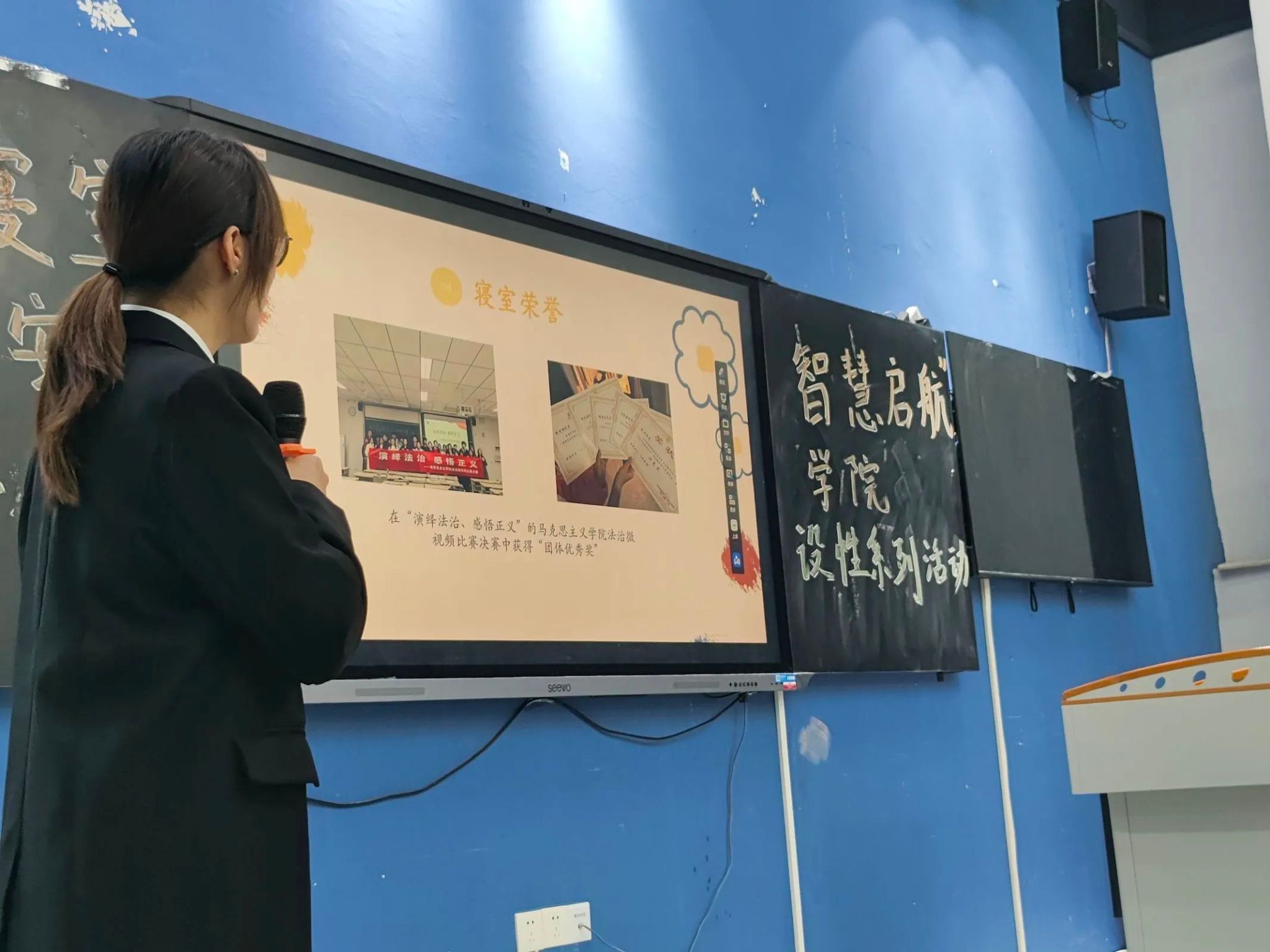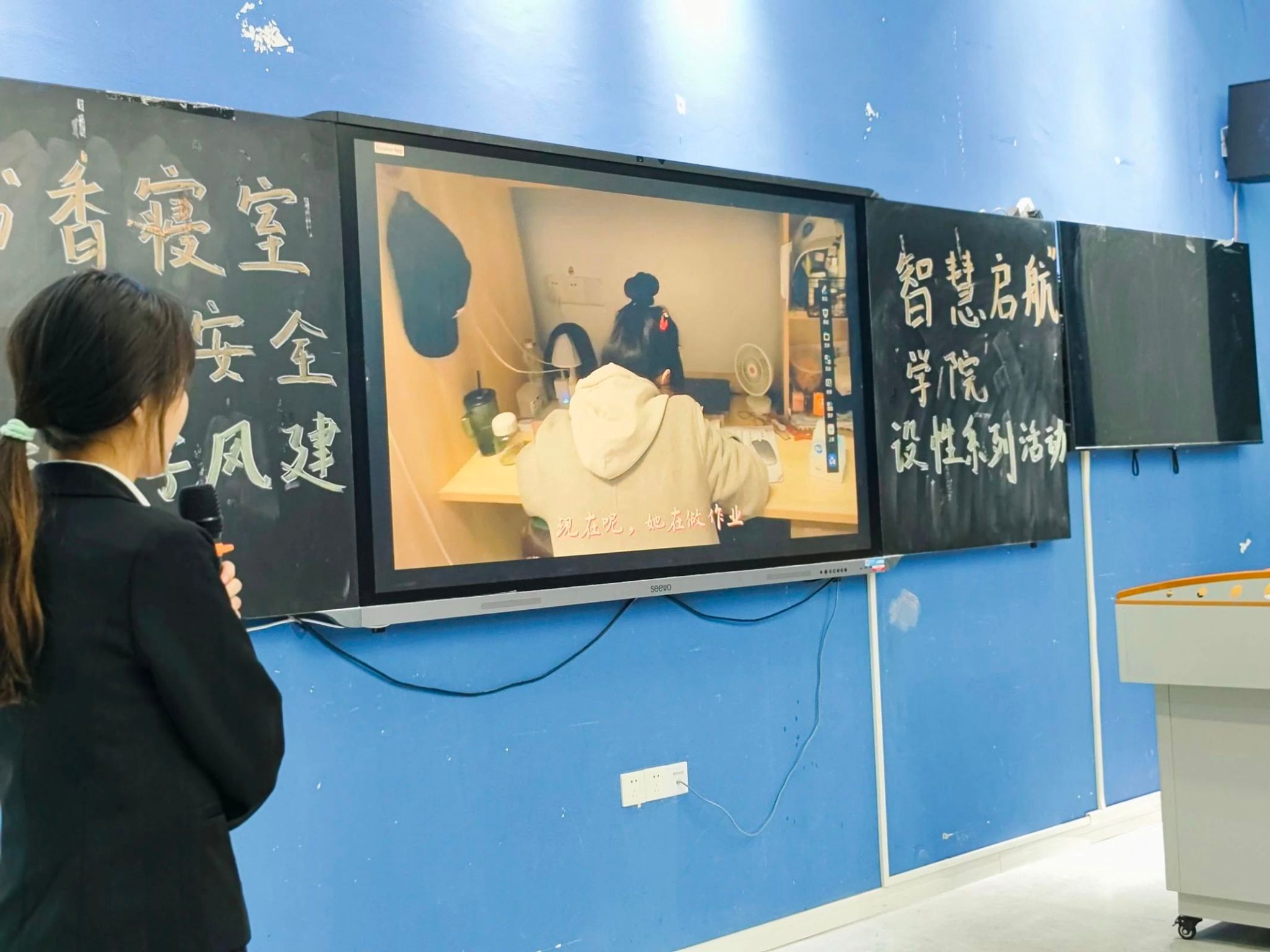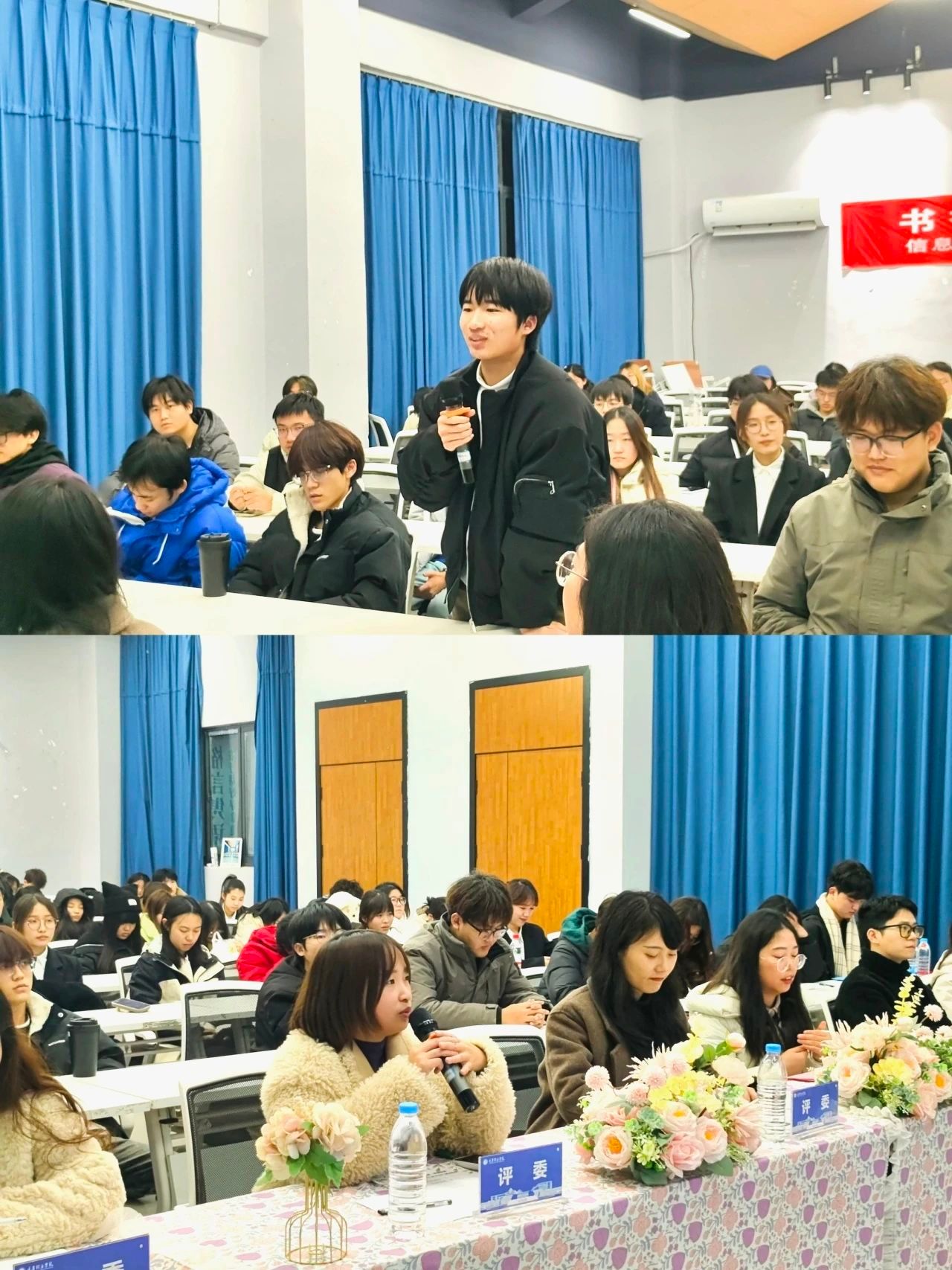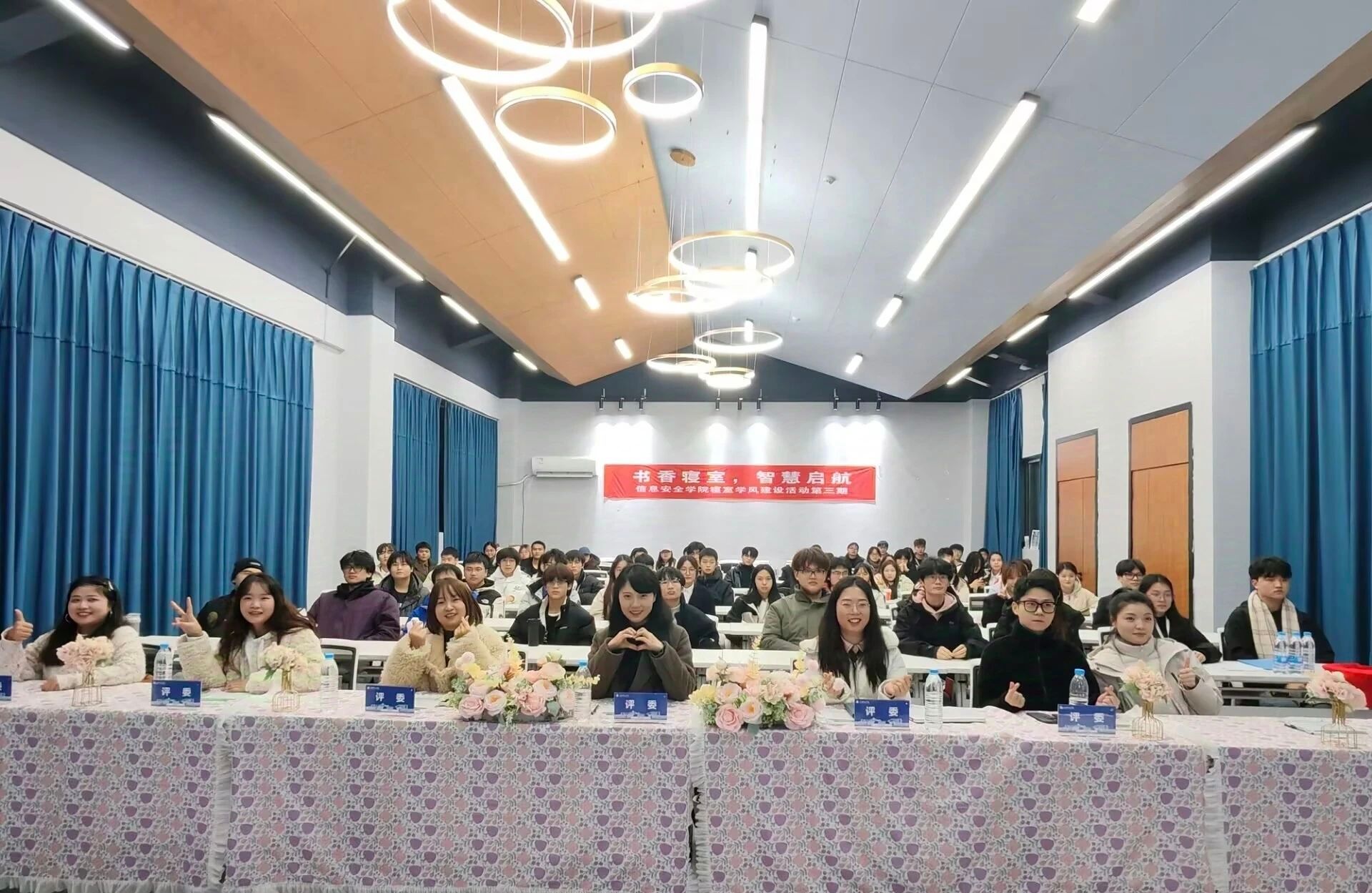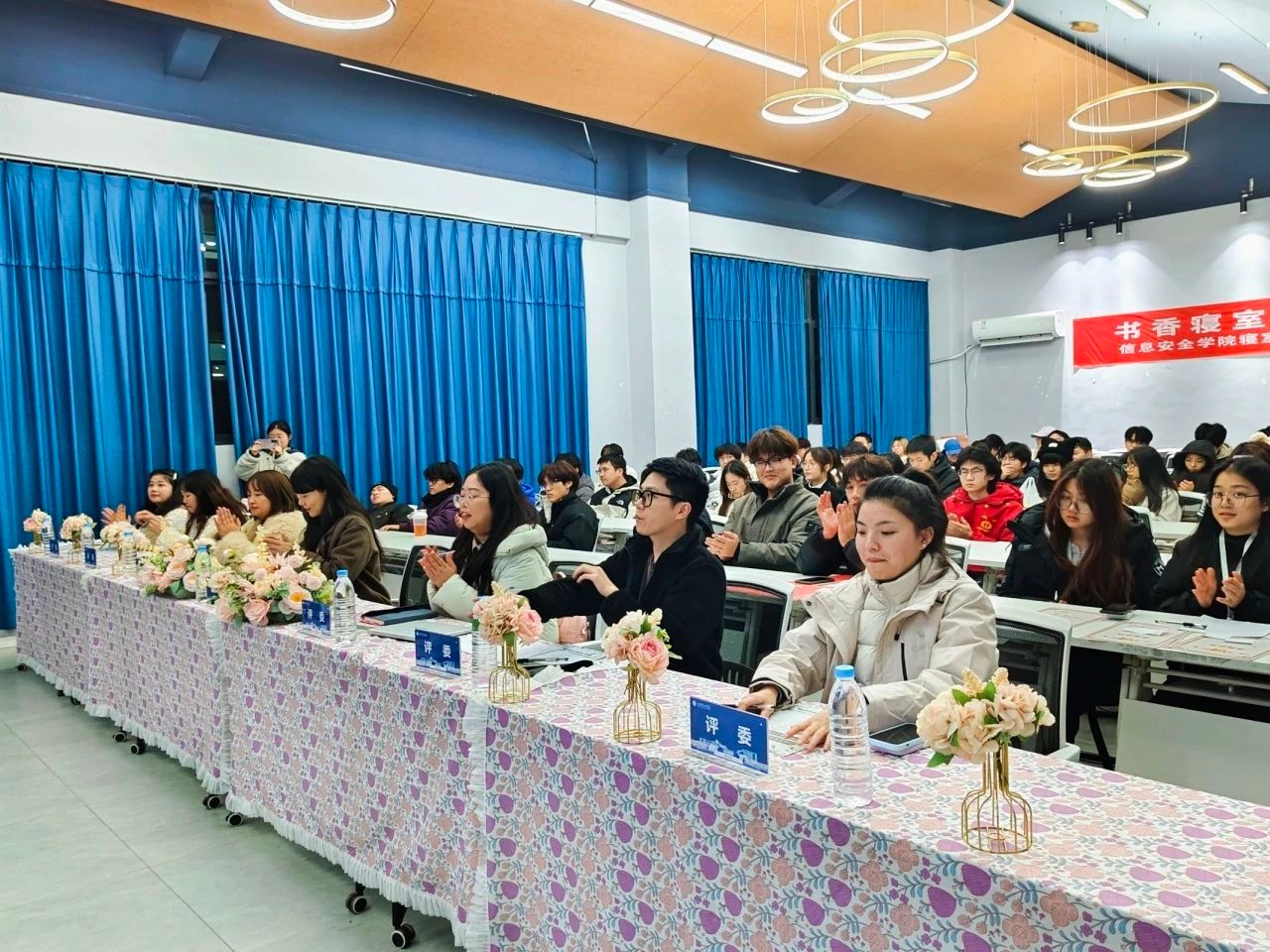 前三组汇报完毕后,后三组也毫不逊色,依次登台进行精彩汇报。各参赛小组紧紧围绕 “书香寝室,智慧启航” 这一主题,深入挖掘,充分展现了室友之间那坚如磐石的团结力量。临近期末,紧张的复习氛围如潮水般席卷了同学们的生活。然而,正是在这关键时刻,室友之间的互帮互助成为了同学们高效复习的有力保障。同时,各小组也在汇报中展示了寝室成员在自我管理、学习习惯养成等方面的积极探索与实践成果,彰显了当代大学生积极向上、勇于进取的精神风貌。