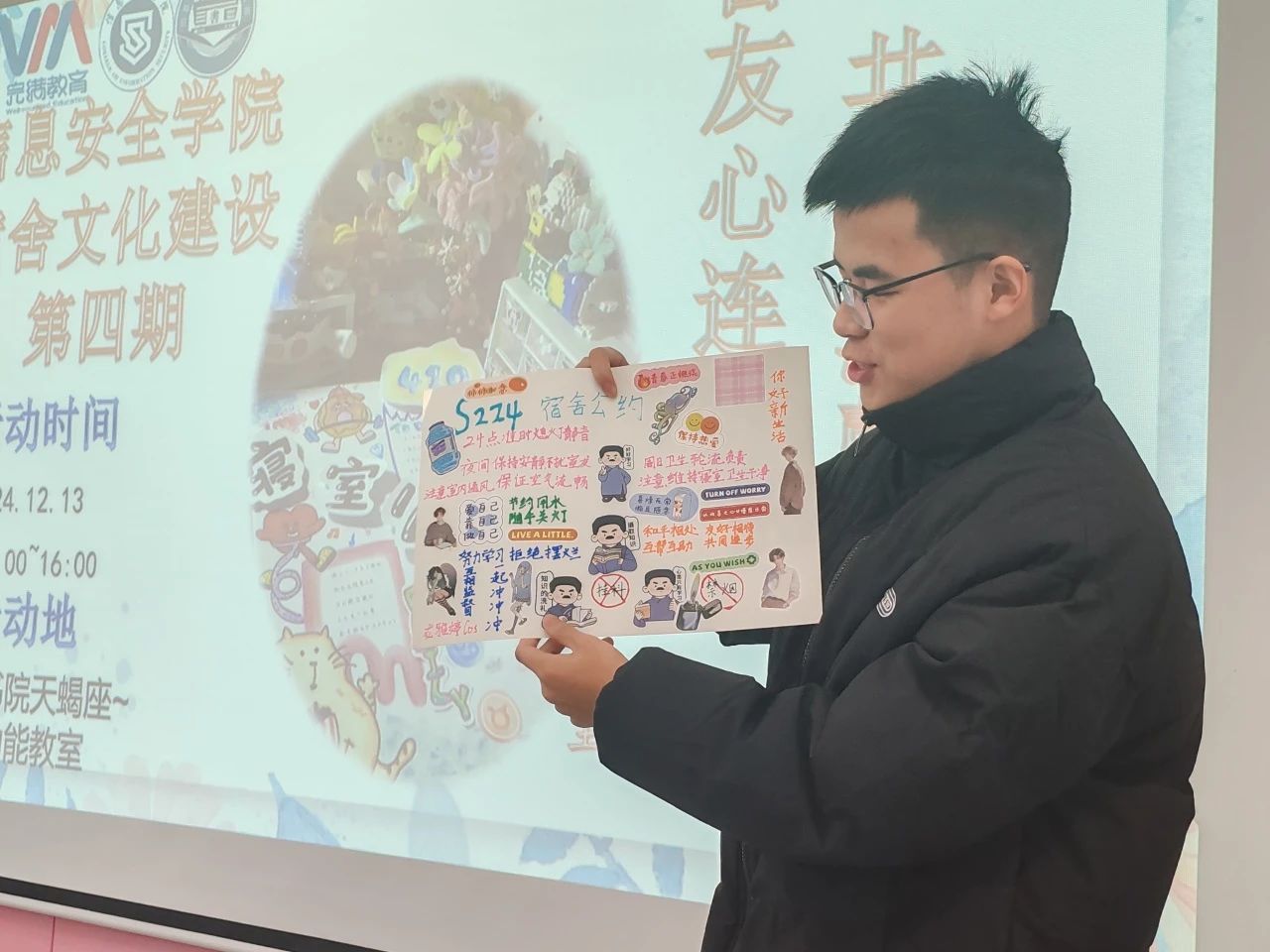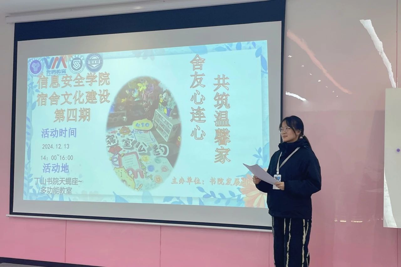 在校园生活中,宿舍是同学们的第二个家,舍友则是朝夕相处的亲密伙伴。然而,因为大家来自不同的地域,有着不同的生活习惯,宿舍生活难免会出现一些小摩擦。为了营造更加和谐、温馨的宿舍环境,增进舍友之间的感情。信息安全学院书院发展部于2024 年 12 月 13 日下午 14:00在丁山书院天蝎座・多功能教室组织开展了宿舍文化建设系列活动之第四期--“宿约同筑·友睦新章”。这是一次舍友间深度沟通的契机,有助于打破彼此之间的隔阂,进一步加深相互之间的了解。