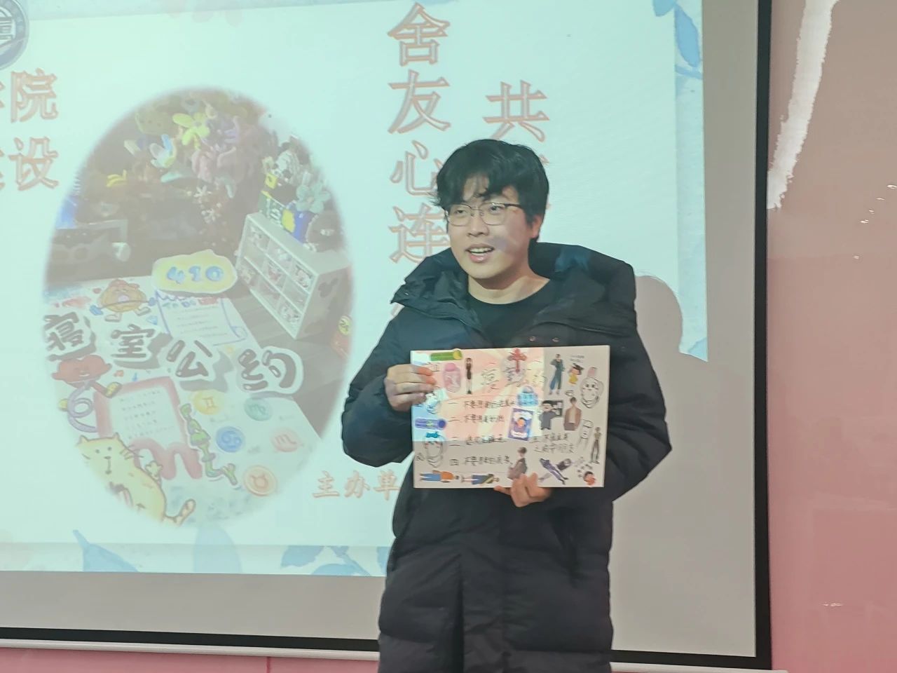 在分享环节,每个宿舍派代表上台展示制作的海报并讲解设计理念。有的海报以温馨的色彩和可爱的图案展现宿舍成员的和谐相处;有的海报将宿舍公约重点突出解释了公约条款如何体现宿舍的民主管理与共同责任。通过海报分享,大家能更深入地领略到各个宿舍独特的宿舍文化,以及宿舍成员们对未来满怀的期待。