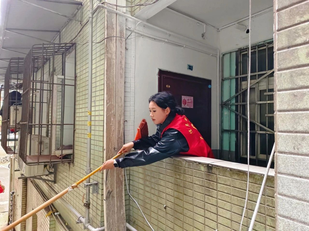 随后志愿者又齐心协力挪动堆积在楼道中的废旧家具、水泥砖块等,让楼道瞬间敞亮开阔,行人畅行无阻。志愿者探出头望向窗檐,其上堆积了数不清的垃圾,他们运用自己的智慧将手工的工具捆绑在一起,延长工具用来剔除窗檐的落叶、纸巾。一番劳作过后,整个社区的焕然一新。