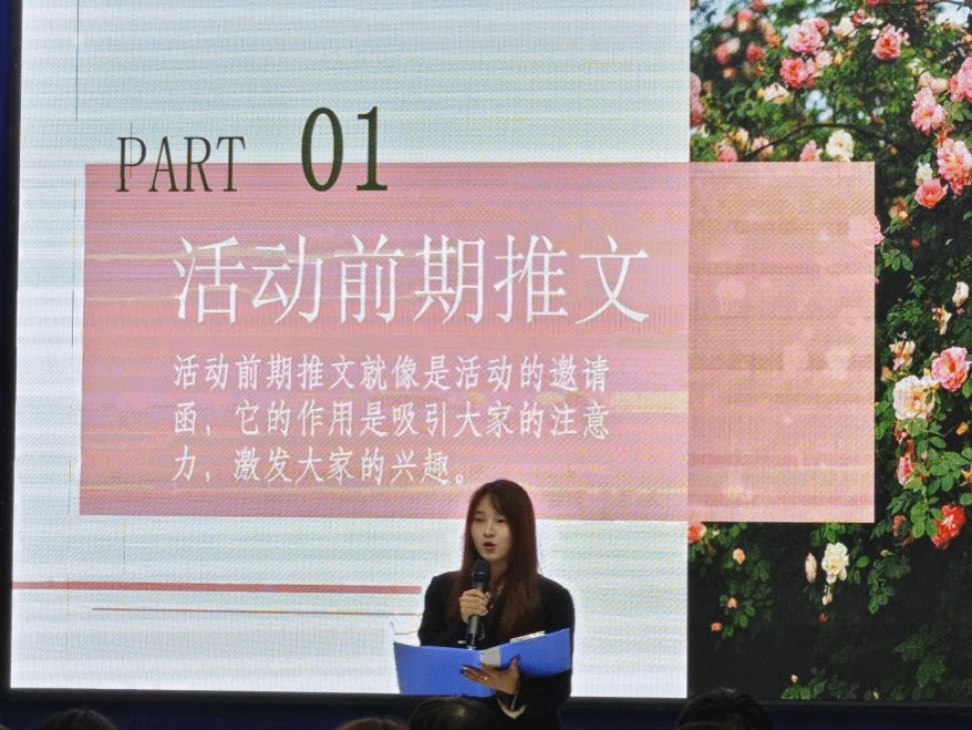 随后信息安全学院团总支青年志愿者协会的代表朱娅玫为同学们带来了关于宣传方面的经验分享。主要包括四个方面,从活动前期的“灵动”推文和引人注目的海报,到活动后期的精彩推文和新闻稿,每个环节对于一个活动的宣传推广来说都是至关重要的。随后通过趣味问答的方式增强大家的记忆,同时也让整体氛围变得更加活跃起来。