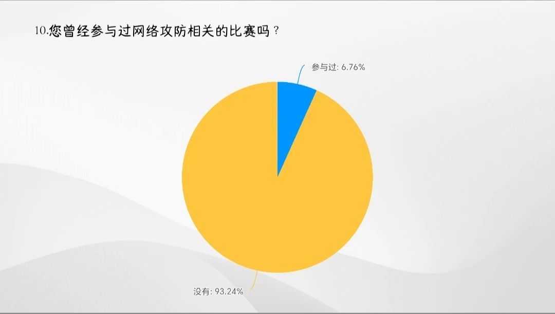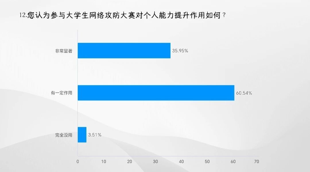 有35.95%的同学认为参与网络攻防大赛对个人能力的提升有非常显著的作用,有60.54%的同学认为有一定作用,只有3.51%的同学认为毫无作用,这一数据表明,学生们普遍认可比赛能提升个人能力。