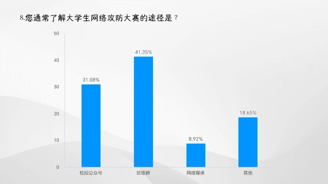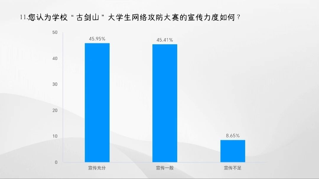 72%的同学通过学校的公众号和班级群了解到全国大学生网络攻防大赛,8.9%的同学通过网络媒体,这说明学校公众号和班级群是主要的信息传播渠道。而对于宣传力度的评价,45.95%的同学觉得宣传充分,45.41%的同学认为宣传一般。整体上,学生们对学校的宣传效果持肯定态度,但仍有提升空间。