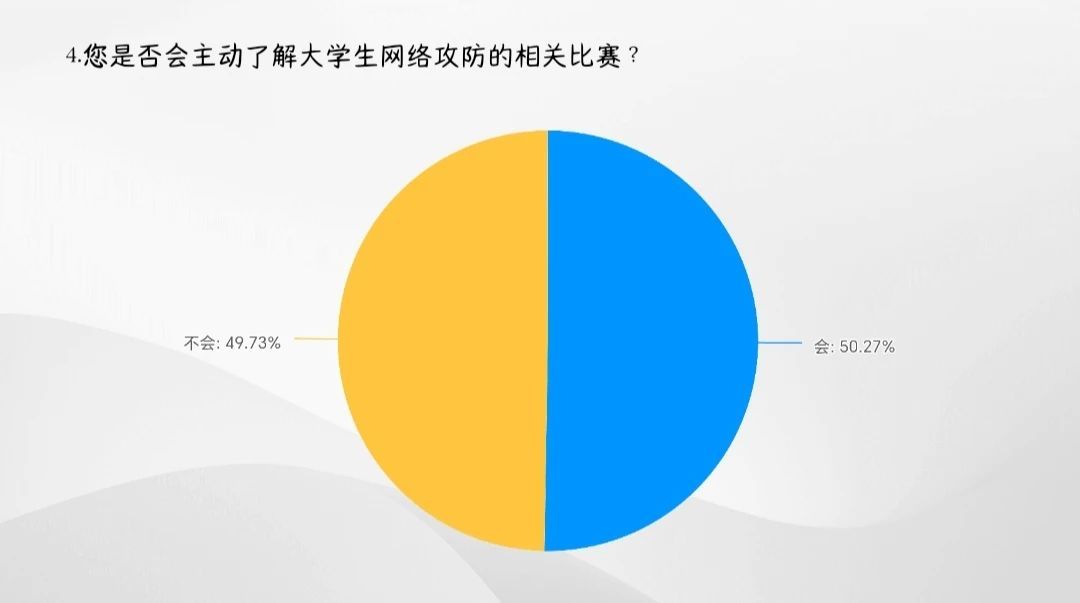 对于是否会主动了解大学生网络攻防的相关比赛,会和不会的人数接近,反映出学生在获取比赛信息上的积极性呈现出差异,其中有6.7%的同学有主动参加过相关的比赛,93.3%的同学没有参赛经验,说明大多数学生缺乏实战经验,需要更多的动员和鼓励。
