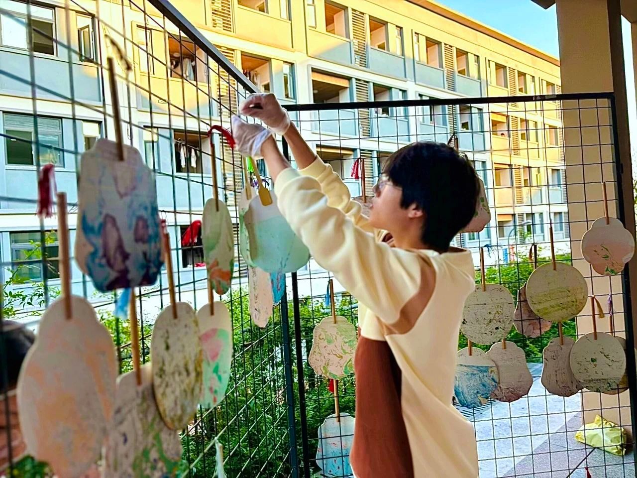 参与者亲自动手之际,一张张面容难掩兴奋之情,一颗颗心脏紧张而又激动。在主持人和志愿者的悉心指导下,参与者将颜料缓缓倒入水中,用筷子轻轻搅拌,直致相互交融。一把把漆扇从水中取出,古典雅致的气息瞬间扑面而来。每一把漆扇皆独具特色,参与者将对传统非遗文化的深刻理解与感悟融入每一抹色彩之中,展现出中国传统文化的意境之美。