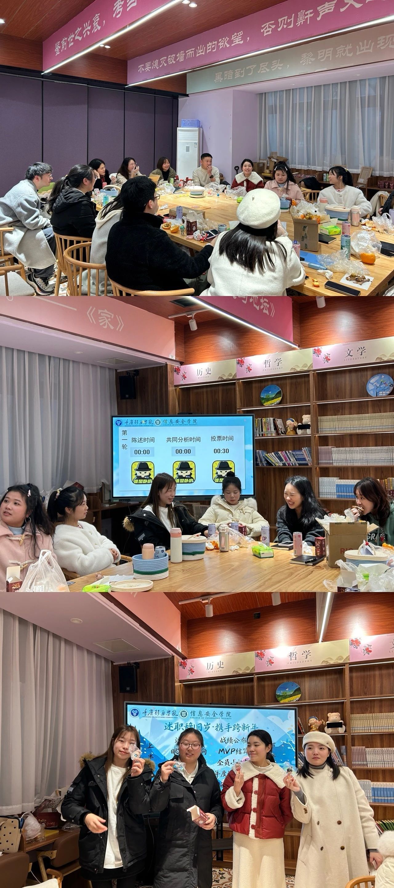年终岁尾是好时,完满总结启新篇。为进一步加强信息安全学院学生工作队伍素质,回顾本学期工作出彩点,反思可改进之处,助力新一年的工作更上一层楼,同时借此机会相约于书院,在家文化活动场域,感受学工队伍其乐融融的氛围。2025年1月6日下午14:30,信息安全学院“述职辞旧岁·携手跨新年”为主题的学工活动在观云书院芒种书吧举行。本次活动由辅导员郭秋思主持,学工队伍全员出席,共同回顾过去,展望未来。