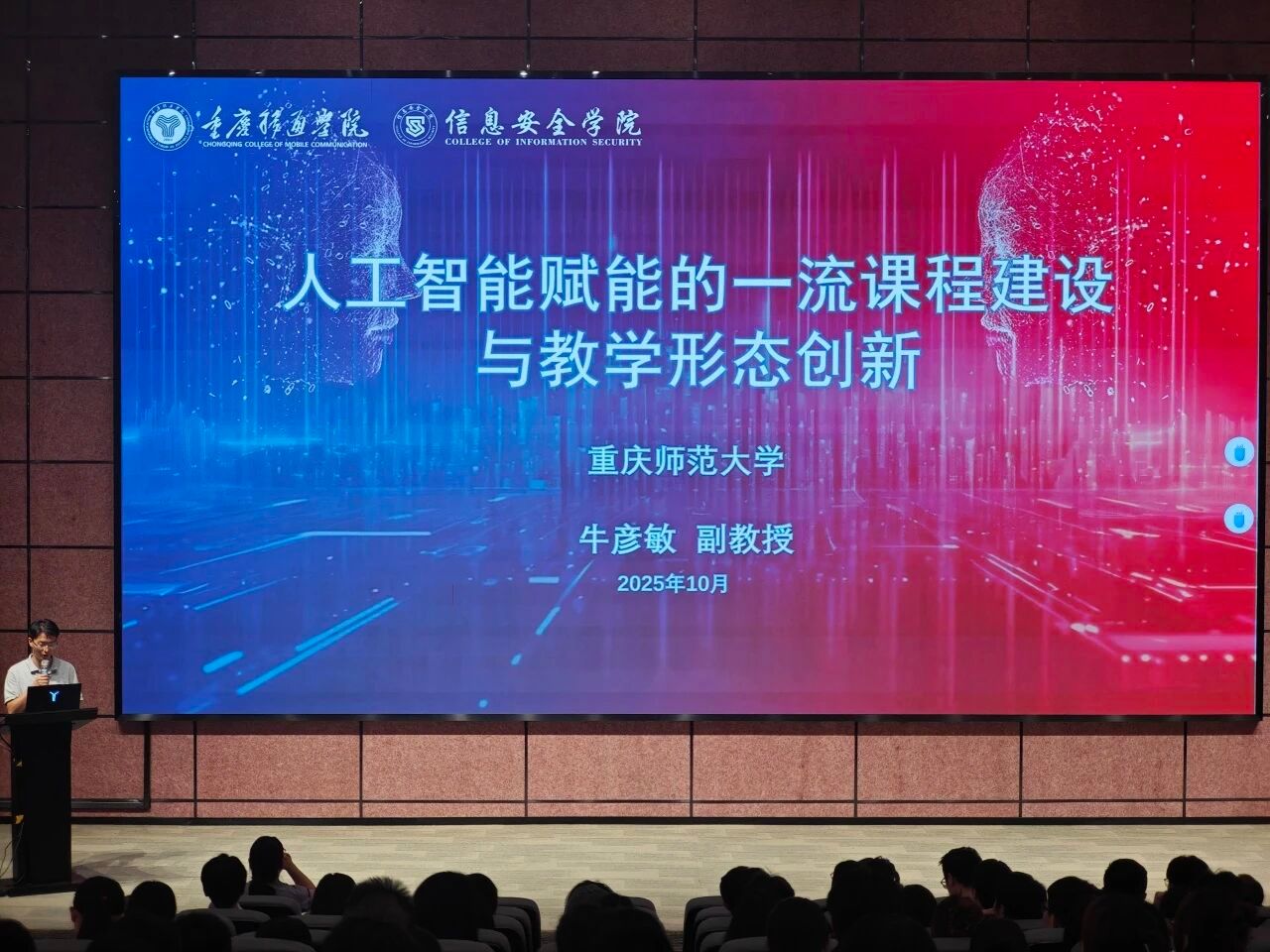 为深化人工智能与教育教学的融合创新,破解一流课程建设中的实践难题,提升教师数字化教学能力,2025年10月11日16:00-18:00,由重庆移通学院信息安全学院主办的“人工智能赋能的一流课程建设与教学形态创新”主题讲座,在綦江校区贤者楼423报告厅举行。本次讲座特邀重庆师范大学副教授、硕士生导师牛彦敏主讲,本次讲座由信息安全学院软件工程教研室主任王燚主持,代理教学副院长周小艳、各教研室主任及全体专任教师共同参会。