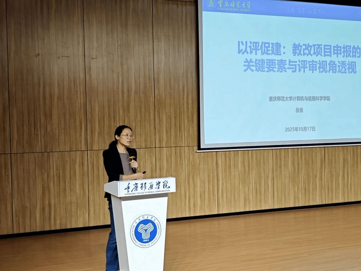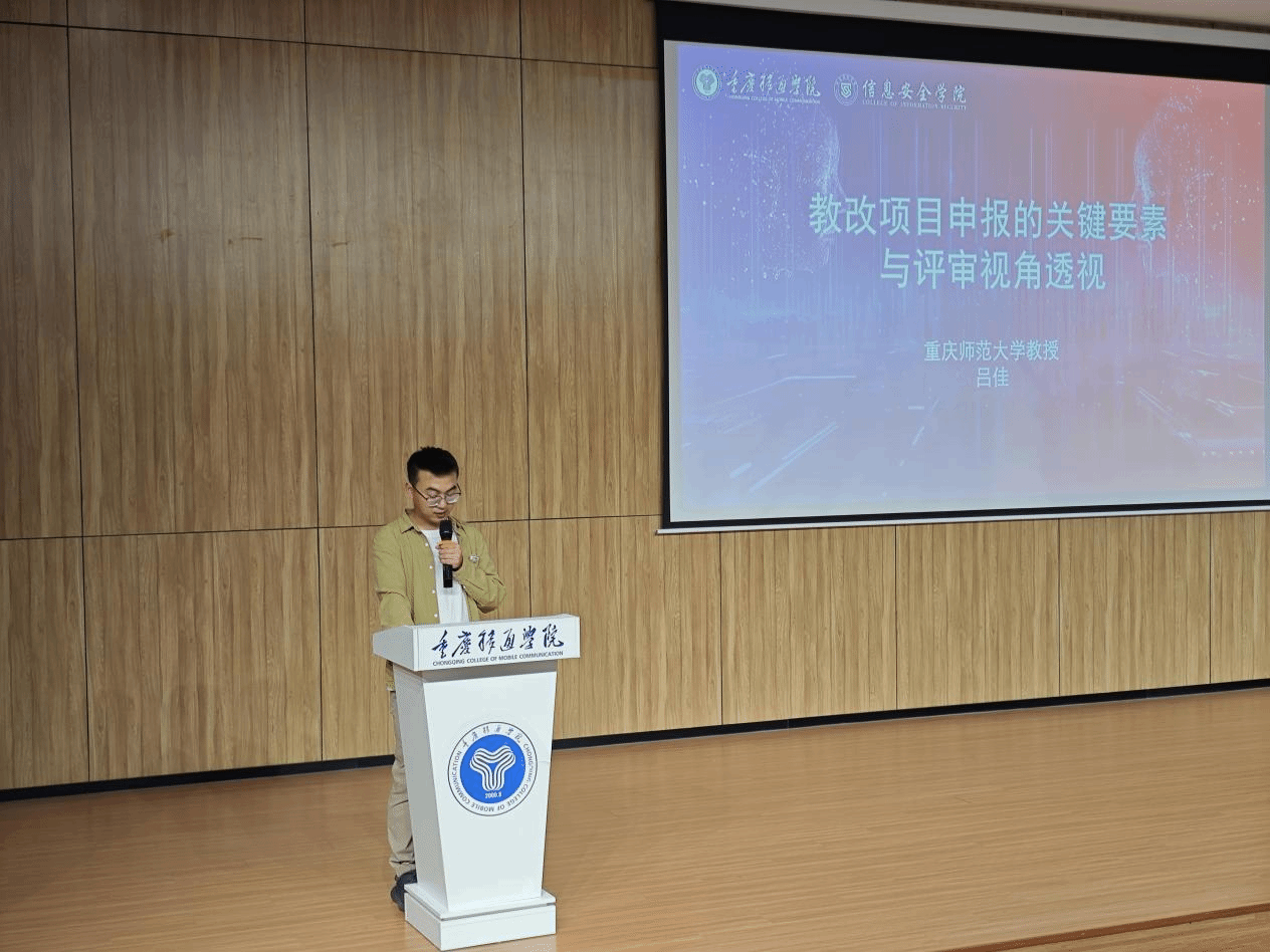 2025年10月17日10:00-12:00,为帮助教师精准把握教改项目申报逻辑,提升申报材料质量与立项成功率,重庆移通学院信息安全学院在綦江校区贤者楼131教室,成功举办“教改项目申报的关键要素与评审视角透视”主题讲座。本次讲座作为“古剑沙龙”第24期活动,特邀重庆师范大学教授、硕士生导师吕佳主讲,由信息安全学院网络工程教研室主任黄海军主持,代理教学副院长周小艳、各教研室主任、骨干教师及专任教师全程参与。