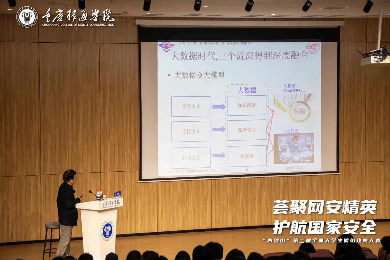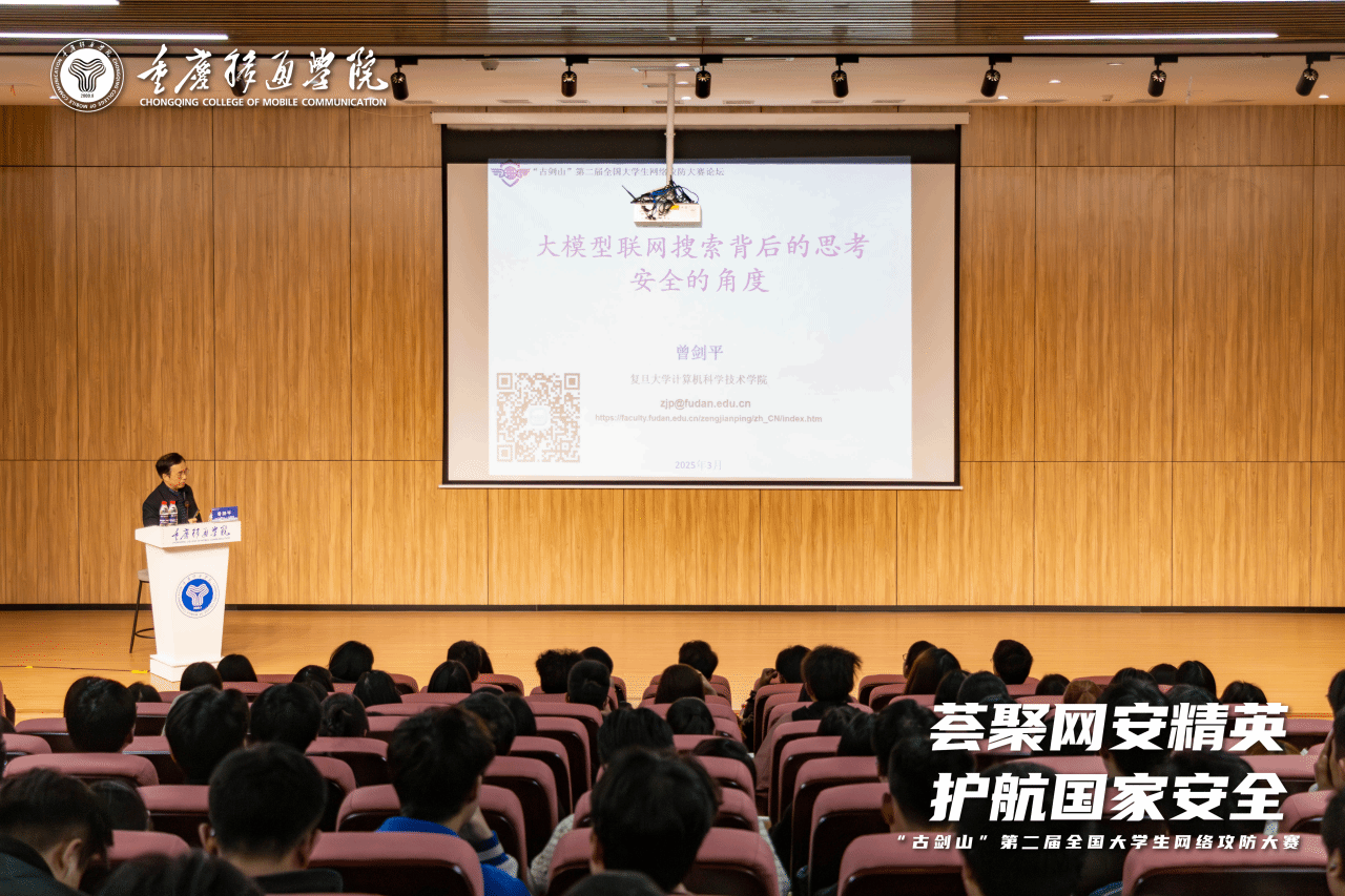 3月28日,由重庆移通学院主办的“古剑山”第二届全国大学生网络攻防大赛名家大讲坛第三场,于重庆移通学院綦江校区贤者楼131顺利举行。特邀复旦大学副教授曾剑平开展主题为《大模型联网搜索背后的思考:安全的角度》的讲座,深入探讨了大模型在联网搜索过程中面临的安全挑战与应对策略。此次活动由名师课堂办公室李富强老师主持,信息安全学院代理教学副院长周小艳及众多学院师生共同出席讲座。