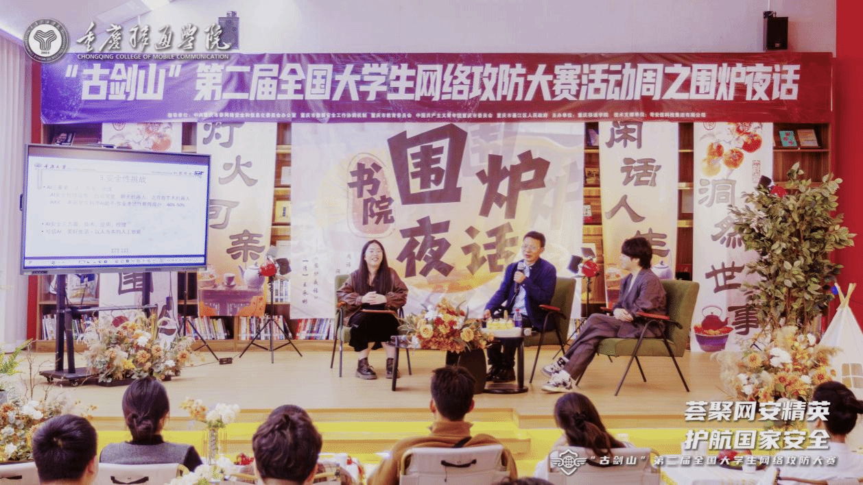 2025年3月27日19:00-21:00,“古剑山”第二届全国大学生网络攻防大赛活动周围炉夜话第二场于重庆移通学院綦江校区古剑书院如期举行。此次活动特邀重庆移通学院戏剧影视学院副教授、动画专业建设负责人李如冰,信息安全学院代理教学副院长周小艳作为对话嘉宾,重庆大学教授、重庆市认知科学学会副理事长、重庆市学术技术带头人何中市作为主讲嘉宾,与綦江区图书馆馆长韩丹、重庆邮电大学副教授邓欣、綦江区蓝月亮书店法定代表人李英以及全校60余名师生代表共同探讨《AI助手:人工智能应用及安全性挑战》。