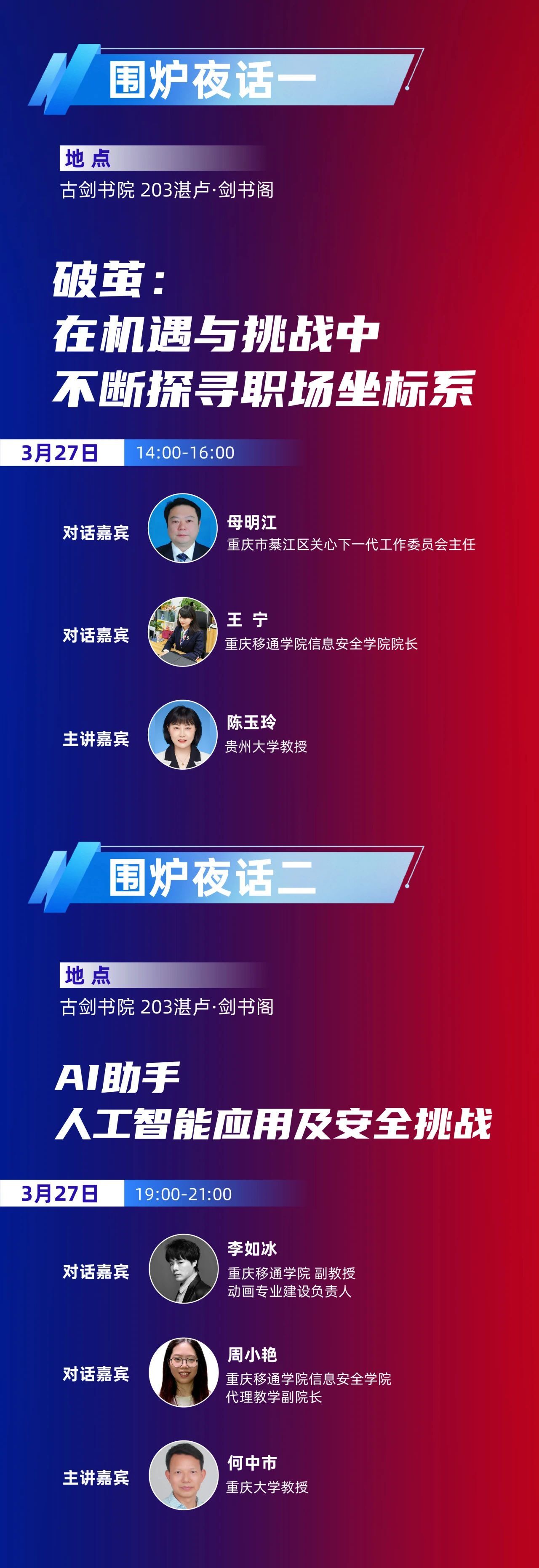 围炉夜话1特邀綦江区关工委主任母明江、重庆移通学院信息安全学院院长王宁作为对话嘉宾,贵州大学陈玉玲教授作为主讲嘉宾带来《破茧:在机遇与挑战中不断探寻职场坐标系》,以丰富的职业洞见,为您解开职业发展的密码;围炉夜话2特邀重庆移通学院戏剧影视学院副教授李如冰、信息安全学院代理教学副院长周小艳作为对话嘉宾,重庆大学何中市教授作为主讲嘉宾深入探讨《AI助手:人工智能应用及安全挑战》,带我们理性审视AI浪潮中的机遇与隐忧,把握数字时代的脉搏。
