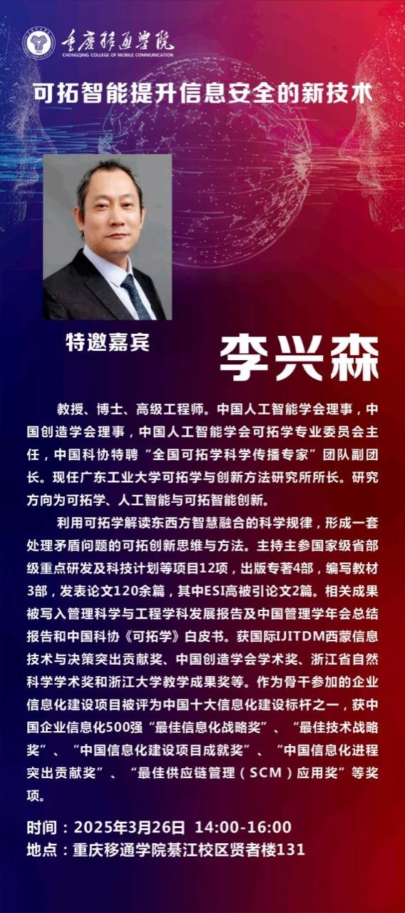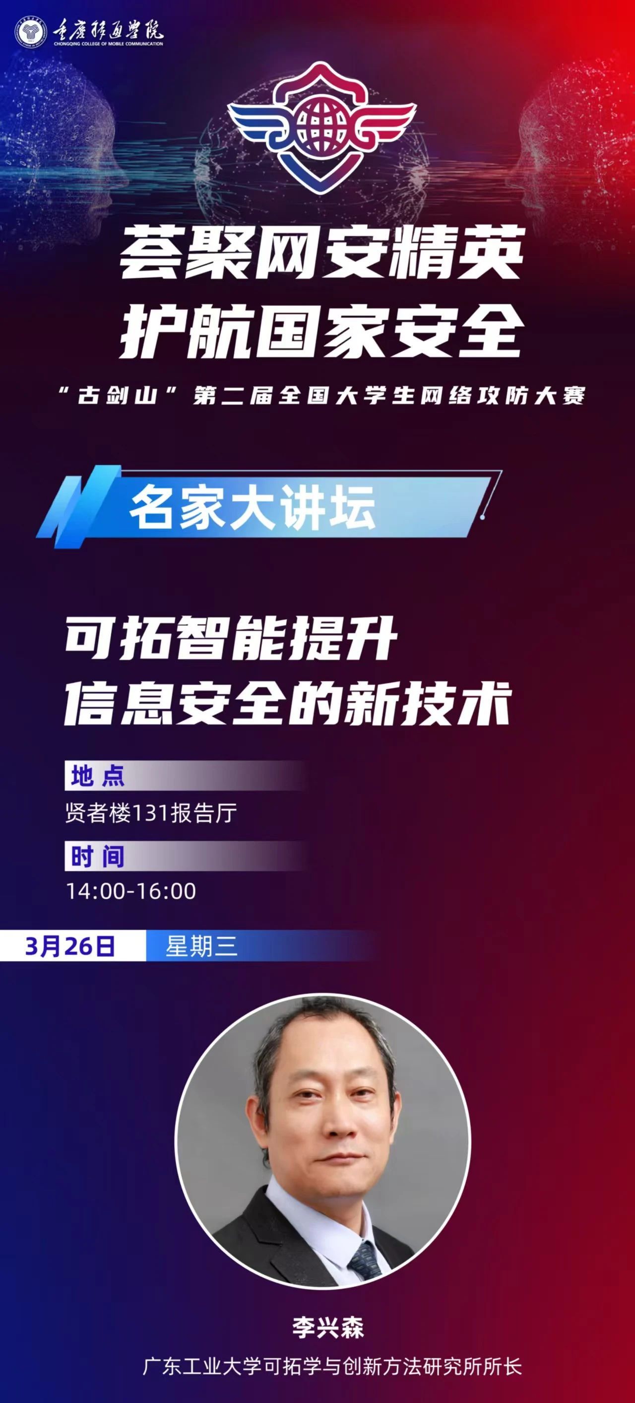 作为活动周首场重磅环节,名家大讲坛将特邀广东工业大学李兴森教授分享《可拓智能提升信息安全的新技术》主题讲座,带你直击信息安全领域前沿,解锁创新攻防思维。