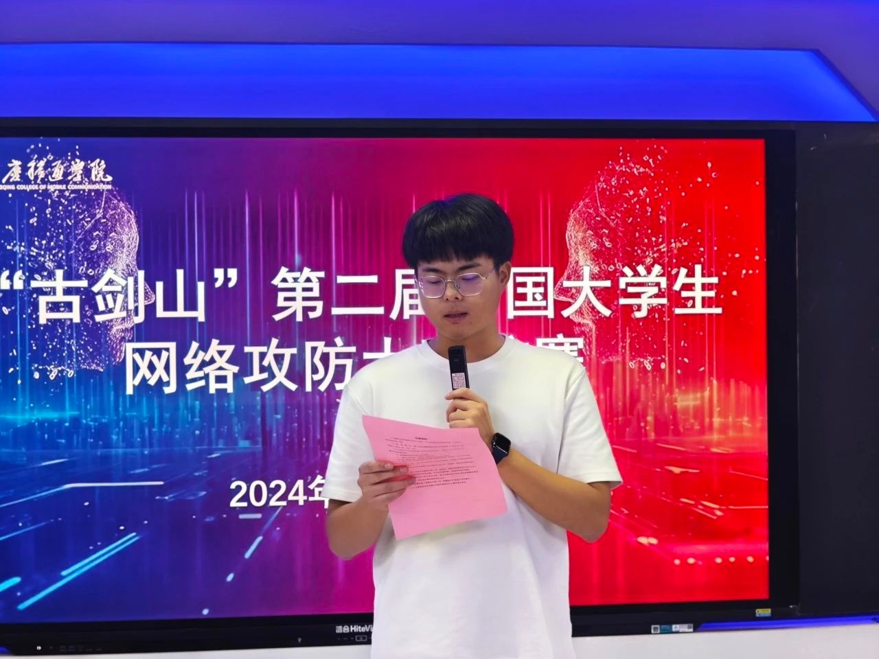 网络安全是国家安全的重要组成部分,培养具备高水平攻防能力的网络安全人才,既是高校教育的责任,也是服务国家战略需求的使命。信息安全学院多年来致力于在网络安全人才培养方面不断创新,依托先进的实验平台和丰富的教学资源,打造了一支专业的师资队伍,并通过开展形式多样的比赛、培训和实战演练,提升学生的实践能力。2024年10月25日,信息安全学院在贤者楼成功举办了第二届“古剑山”全国大学生网络攻防大赛校赛。本次比赛采取CTF积分赛制,共有53支队伍,154名选手报名参赛,参赛规模和参与热情较去年显著提升。作为全国大赛前的预热和选拔赛,本次校赛不仅是对参赛选手网络安全技术的集中检验,也为我校筛选优秀选手备战全国赛提供了重要平台。