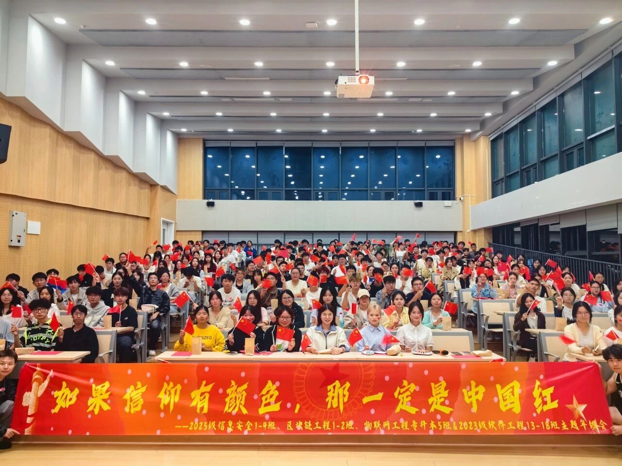 为激励同学们深刻体悟国家认同、勇担时代重任,坚定实现个人价值与国家发展的有机统一,2025级信息安全1-4班&区块链工程1-2班于10月17日19:00在玉棠书院开展了“如果信仰有颜色”主题年级会,以沉浸式体验厚植家国情怀,以青春视角诠释信仰力量。