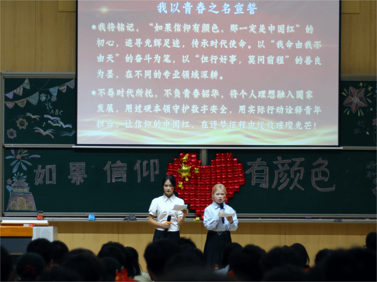 活动尾声,全体学子在主持人的带领下庄严宣誓,铮铮誓言响彻教室,尽显青年担当;全场齐唱《我和我的祖国》,在激昂的歌声中,本次主题年级会圆满结束。