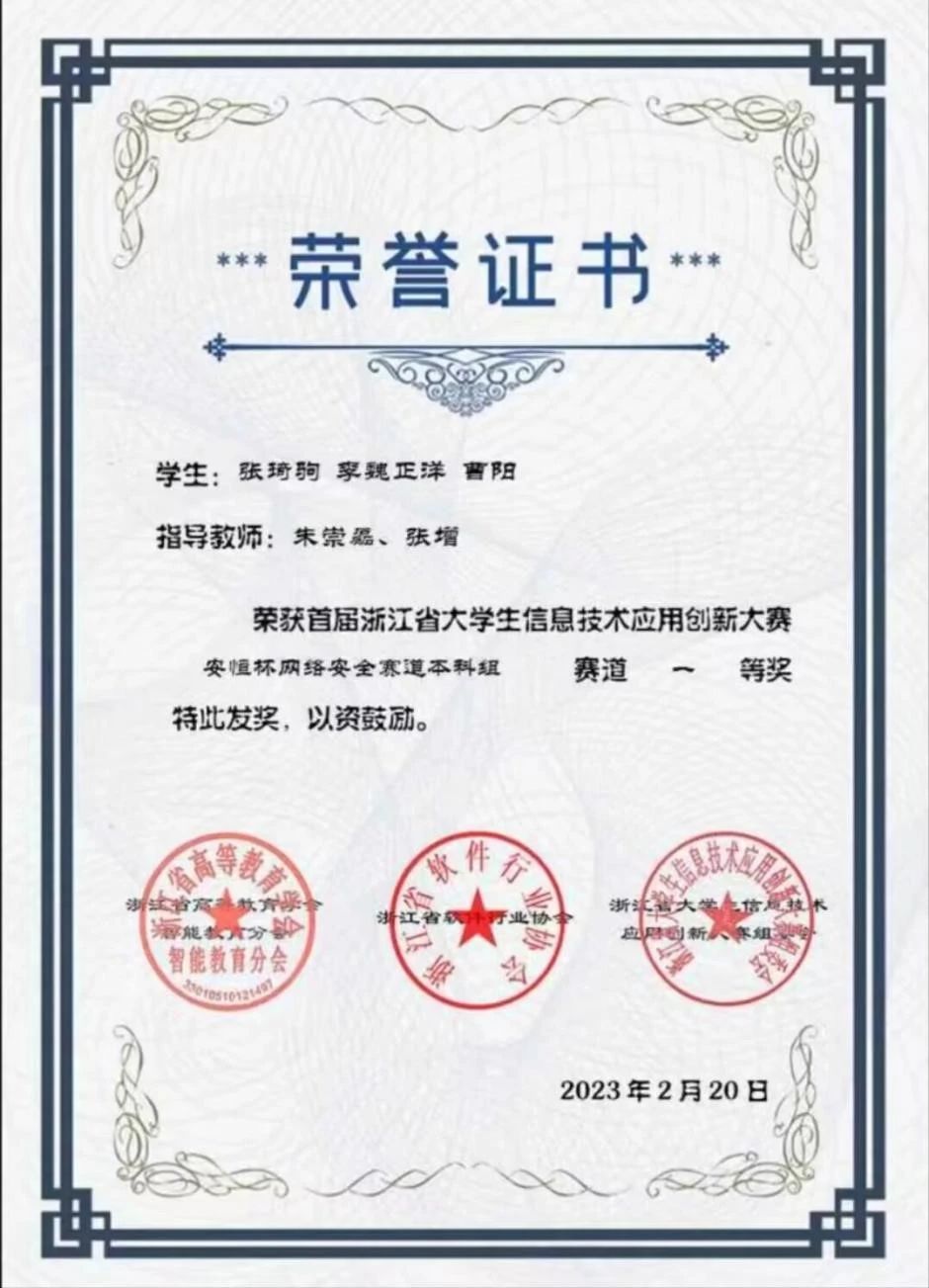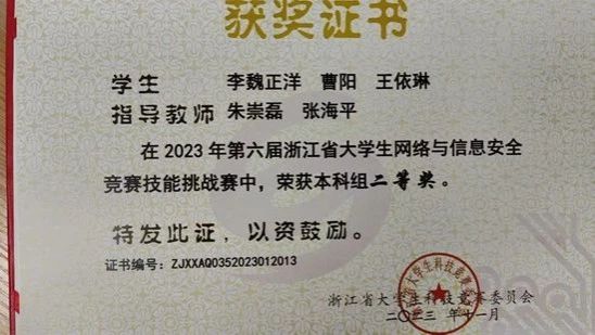 2023年第六届浙江省大学生网络与信息安全竞赛技能挑战赛获奖荣誉