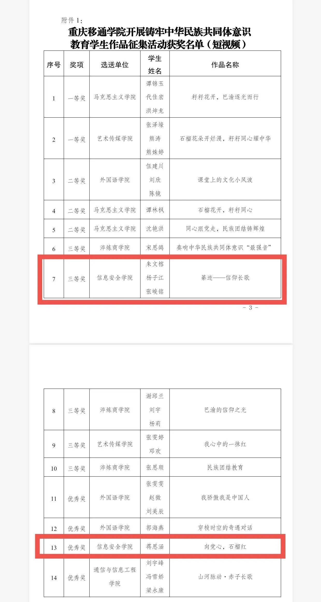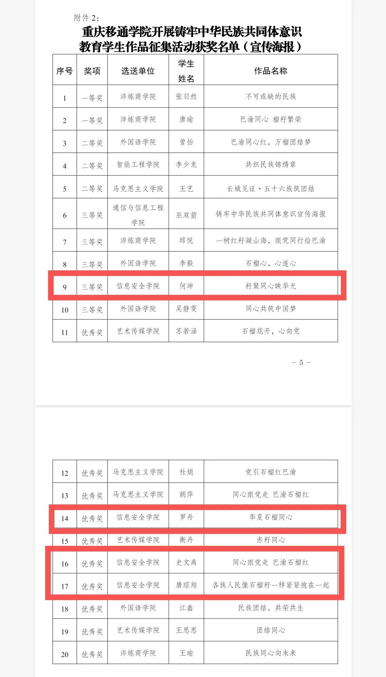经过专业评审,信息安全学院师生在此次活动中表现优异,斩获多个奖项。朱文榕、杨子江、张峻铭的《綦迹——信仰长歌》获得短视频类三等奖,何珅的《籽聚同心映华光》获得宣传海报类作品三等奖,蒋思涵、罗丹、史文禹、唐琮翔获得优秀奖。袁佳、张雪梅、谭倩、郭福禄获评优秀指导老师。这些荣誉不仅是对学院师生创作能力的高度认可,更是对学院长期以来重视民族团结教育工作的充分肯定。