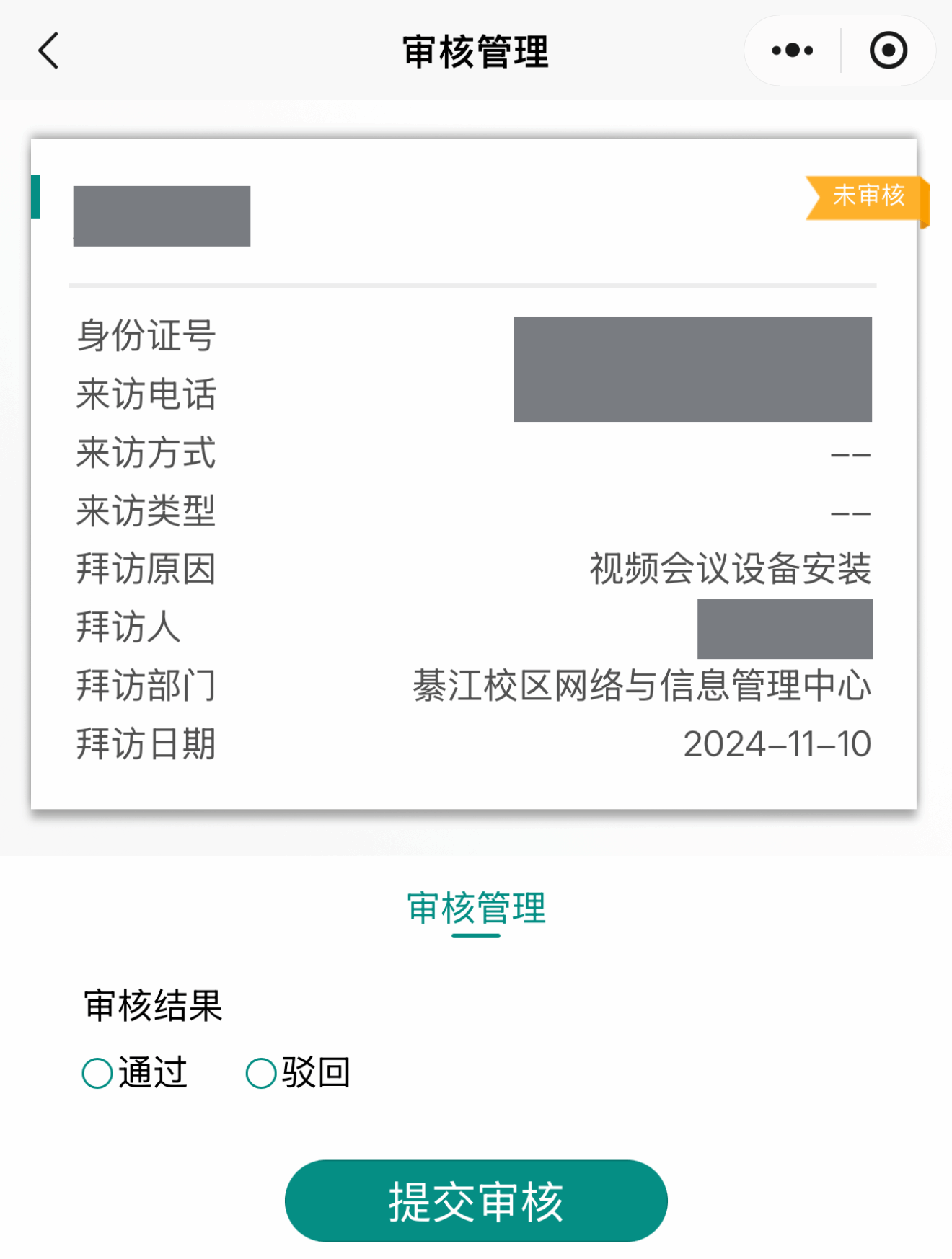 当非本校人员提交预约申请后,该申请会实时推送至相关部门,部门负责人可在指尖移通小程序访客预约审核中完成审批,具体操作如下。
